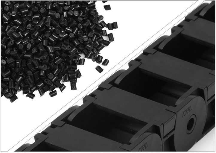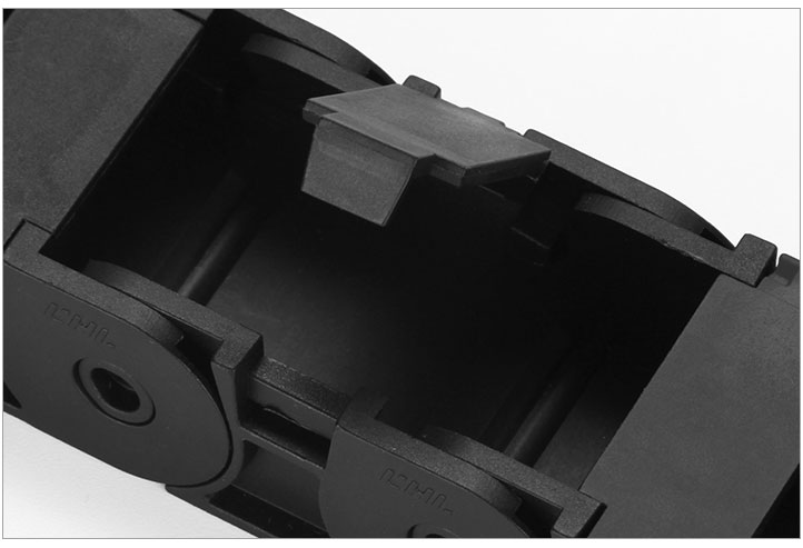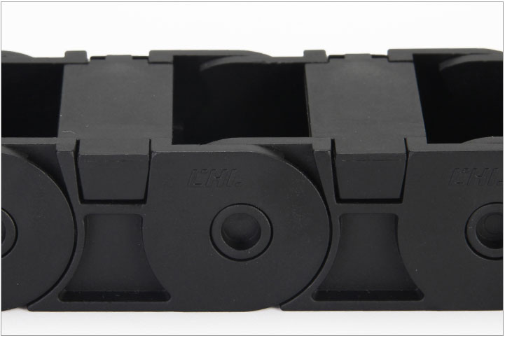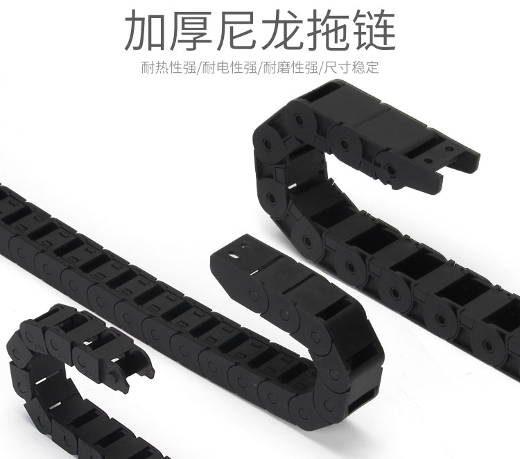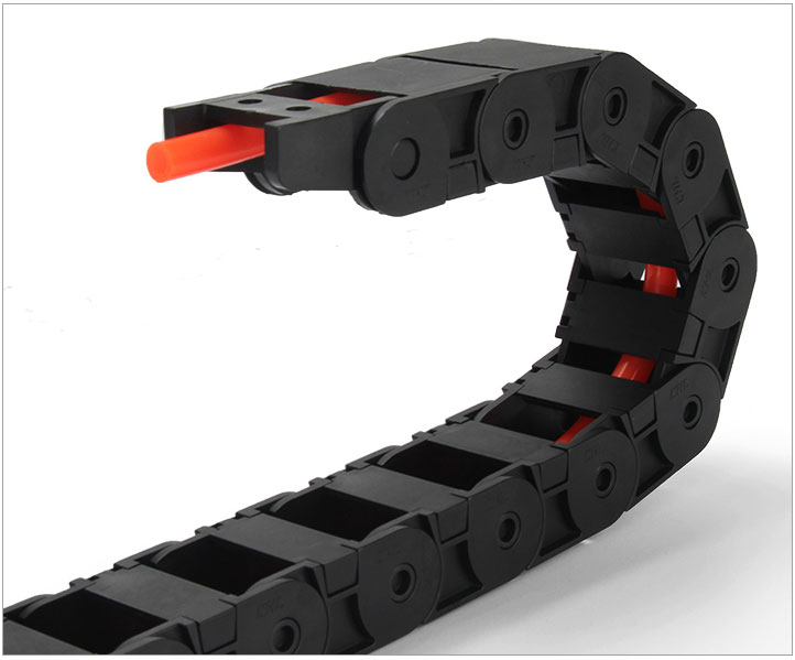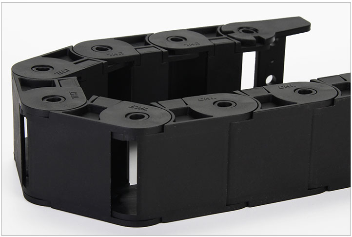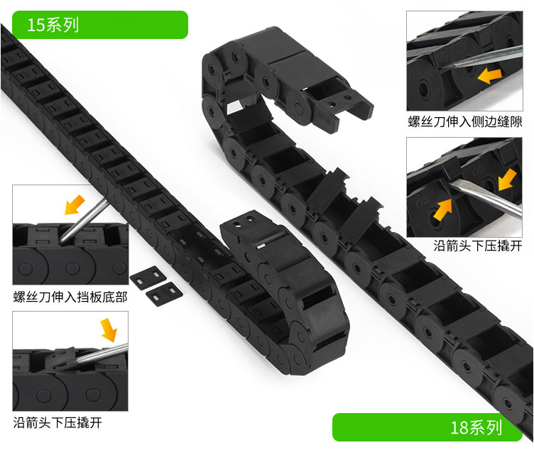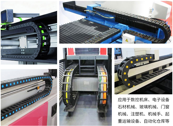 拖鏈每節(jié)都能打開,裝拆維修方便,不必穿線,打開蓋板后即可把電纜、油管、氣管、水管等放入拖鏈;