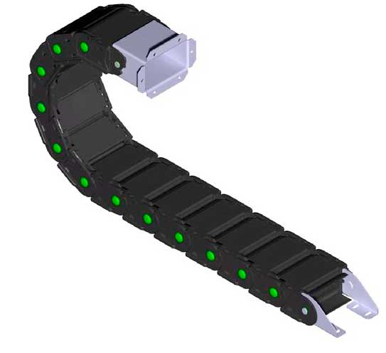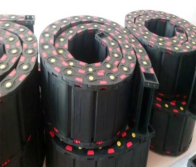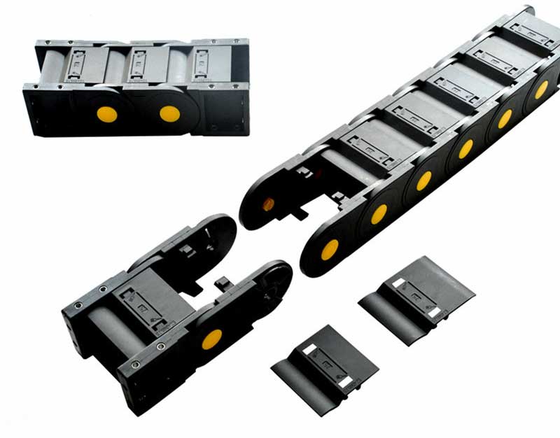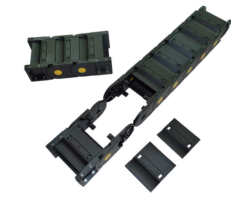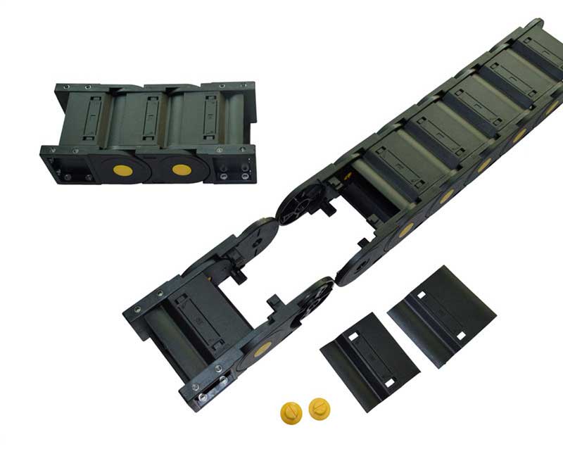 塑料拖鏈由兩個(gè)側(cè)鏈連接在一起,頂部和底部通過(guò)橋接件連接在一起。