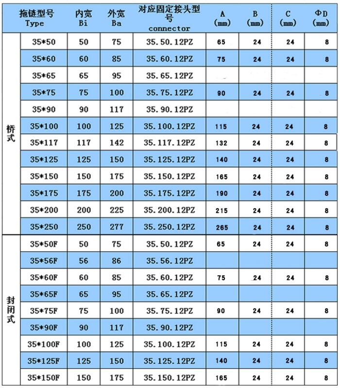 25系列工程塑料拖鏈規格: